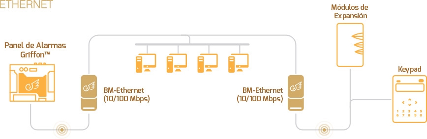 - Soporta Bridge Modules para comunicación de los módulos de expansión y teclado a través de redes Ethernet y Wi-Fi;